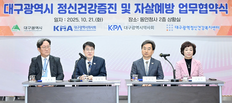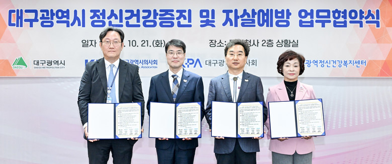 ▸ 정신·자살 고위험군 발굴 및 생명지킴이 활동 영역 확대 [세계타임즈=대구 한윤석 기자] 대구광역시는 10월 21일(화) 오전 11시 동인청사 2층 상황실에서 ‘대구광역시 정신건강 증진 및 자살예방 업무협약’을 체결했다. 이번 협약은 대구 시민의 정신건강 증진과 자살 예방을 위한 지역사회 거버넌스 구축을 목표로 한다.