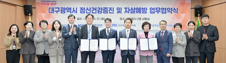 이번 협약을 통해 각 단체는 전문성과 자원을 적극 활용해 ‘대구시민 정신·자살 고위험군 발굴과 정신건강 서비스 연계’와 ‘생명지킴이 홍보 및 활동 참여’ 등에 힘을 모을 계획이다.