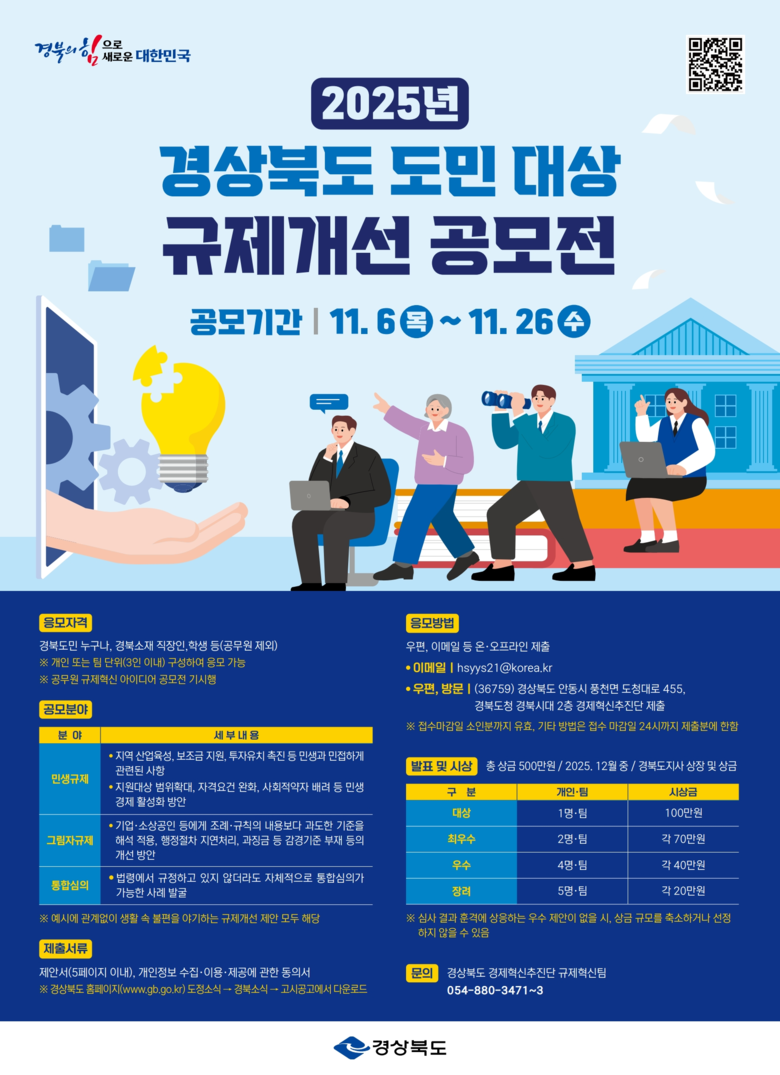 - 경북도민, 경북에 있는 직장인·학생이면 누구나 신청 가능 - [세계타임즈=경북 한윤석 기자] 경상북도는 ‘2025년 경상북도 도민 대상 규제개선 공모전’을 개최한다. 이번 공모전은 도민이 체감하는 불편한 제도나 절차, 지나치게 복잡한 인허가 절차에 대해 도민의 목소리를 직접 듣고 이를 제도개선에 반영하는 것에 목적이 있다.