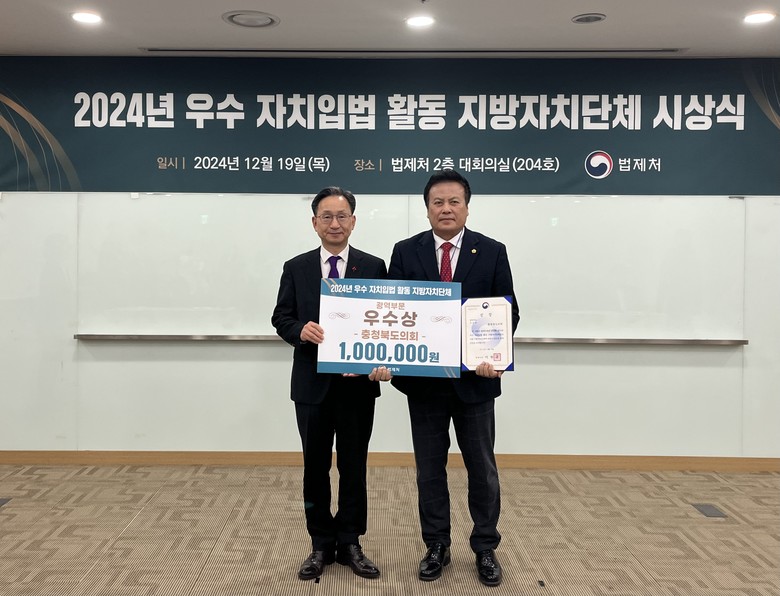 [충북 세계타임즈=이현진 기자] 충북도의회(의장 이양섭)가 19일 법제처 주관 ‘2024년 우수 자치입법 활동 지자체 선정’에서 ‘우수상’을 수상했다.