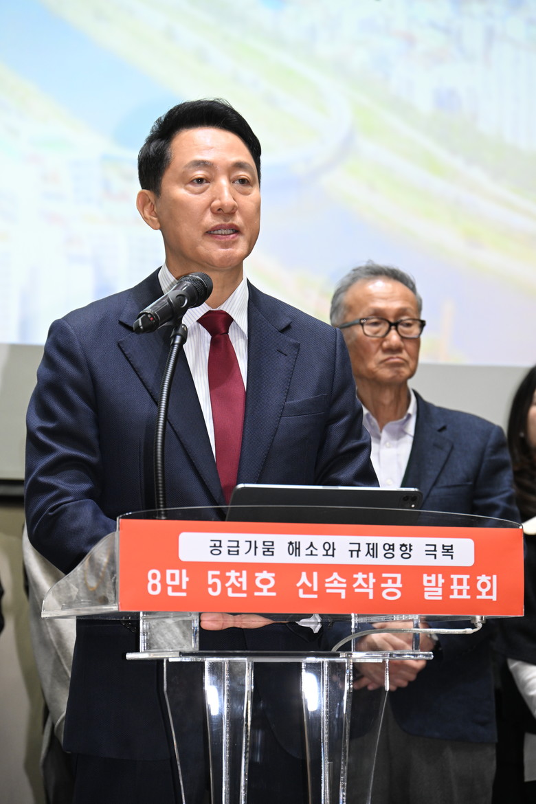 | ▲ 오세훈 서울시장이 26일(목) 서울시청에서 열린 '8만 5천호 신속착공 발표회'에서 서울시 핵심공급 전략사업을 발표하고 있다. |