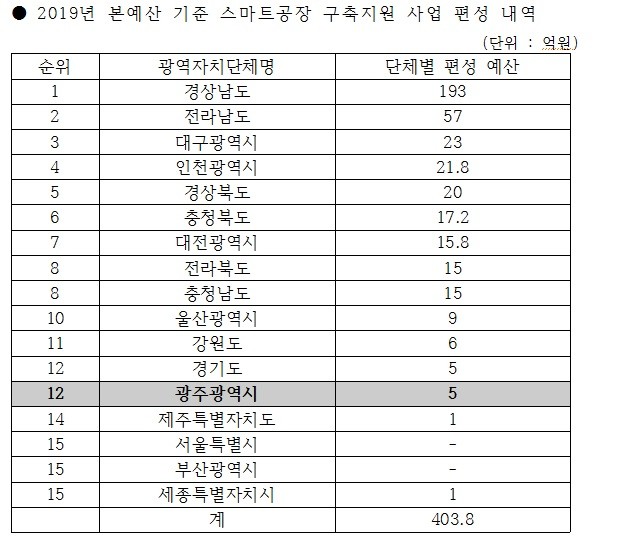 [광주=세계타임즈 손권일 기자] 광주광역시의회 김점기의원은(남구2) 제280회 광주광역시 임시회 산업건설위원회 소관 제2회 추가경정예산안 심의를 위해 제출받은 ‘스마트 공장 구축 지원사업 광역자치단체별 시비 편성액’을 근거로 “스마트공장 구축 지원 사업에 광주광역시의 의지가 부족하다”고 주장했다.