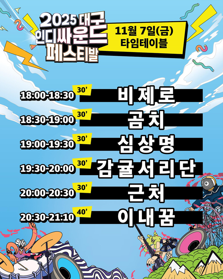 첫날인 7일에는 올해 싱글을 발매한 ▲비제로(대구)의 무대를 시작으로, 창원록페스티벌에 참여한 ▲곰치(경남), 아시아송페스티벌(ASF)에 출연한 ▲심상명(대구), 부산국제락페스티벌에 참여한 ▲감귤서리단(제주), 후쿠오카 한일교류 공연을 펼친 ▲근처(인천), 대구를 기반으로 활동하며 올해 첫 정규앨범을 발매한 3인조 록밴드 ▲이내꿈(대구)이 무대를 꾸민다.