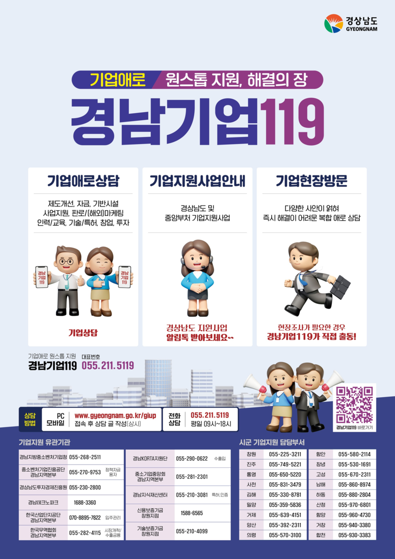 경남기업119는 상담부터 컨설팅, 지원사업 안내, 복합 애로 상담을 위한 기업 현장 방문까지 원스톱으로 지원하는 온라인 기업애로 처리 시스템이다.