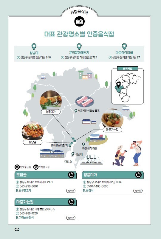 이번 책자에는 도 인증음식점에 대한 설명과 주소, 전화번호, 영업시간, 휴무일 등이 음식사진과 함께 자세하게 수록되어 있고, 지역별 추천 관광지 및 여행코스별 인증음식점을 제공하고 있어 충북을 찾는 관광객들에게 유용한 자료로 활용될 것으로 기대된다.