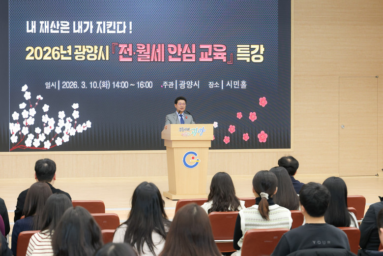 - 임대차계약 필수 확인사항부터 전세사기 예방까지 실질 정보 제공 - [세계타임즈=광양시 우덕현 기자] 광양시는 지난 3월 10일 시청 시민홀에서 봄 이사철을 맞아 「전·월세 안심교육」 특강을 실시했다고 밝혔다.
