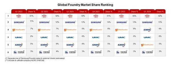 글로벌 파운드리 1위 업체인 TSMC는 점유율 62%로 부동의 선두를 지켰다. 삼성전자는 13%로 2위를 유지했지만 1위와의 격차는 더 벌어졌다.
