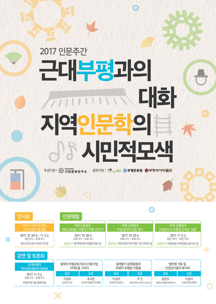 올 인문주간은 ‘역사부평’을 주제로 했던 지난해 인문주간에 이어, ‘근대부평’을 주제로 그 의미를 기억하고 되새기기 위한 현장탐방, 전시회, 강연 및 토론회 등 다채로운 행사가 진행된다.