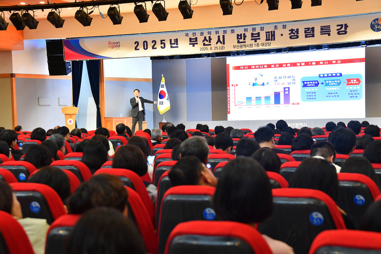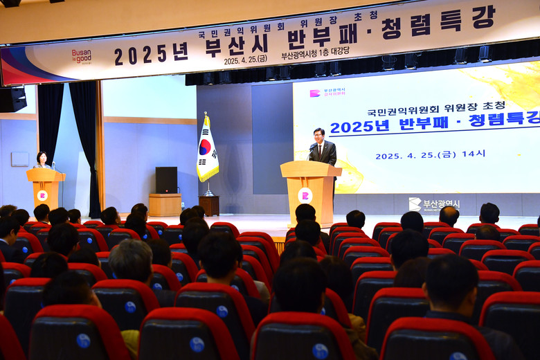 ◈ 시, 부산의 청렴 역량이 함께 올라갈 수 있도록 구·군, 산하 공사·공단 등과 상호 협력해 청렴 시책 추진 예정 [세계타임즈=부산 이용우 기자] 부산시(시장 박형준)는 오늘(25일) 오후 2시 시청 대강당에서 공직자 부패방지 및 청렴도 제고를 위한 '국민권익위원회 위원장 초청 반부패·청렴특강'을 개최한다고 밝혔다.