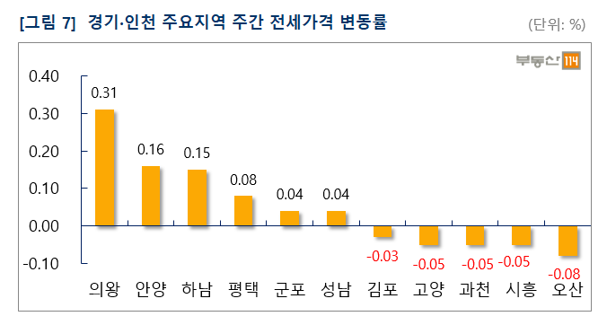 경기ㆍ인천은 △의왕(0.31%) △안양(0.16%) △하남(0.15%) △평택(0.08%) △군포(0.04%) △성남(0.04%) 등은 상승한 반면 ▽오산(-0.08%) ▽시흥(-0.05%) ▽과천(-0.05%) ▽고양(-0.05%) ▽김포(-0.03%) 등 입주물량이 많은 곳 중심으로 하락했다.