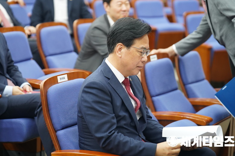 '송언석 '국민의힘 비상대책위원장 겸 원내대표가 3일 오전 서울 여의도 국회에서 열린 의원총회에 참석해 서류를 검토하고있다.