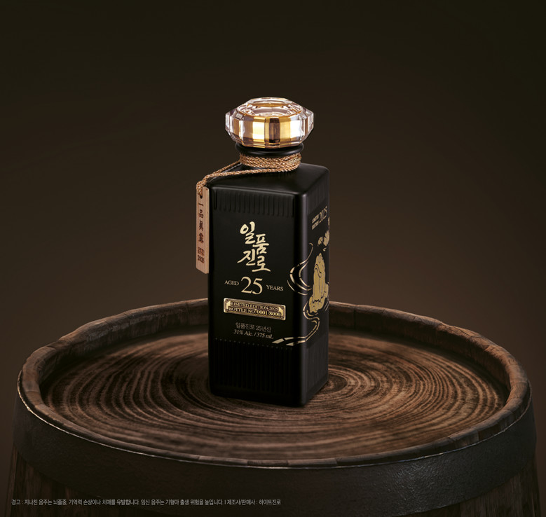 일품진로 25년산은 하이트진로가 수십 년간 축적해온 숙성 및 블렌딩 기술의 집약체로 풍미가 가장 뛰어난 중간층 원액만을 선별해 25년 이상 숙성한 제품이다. 목통의 위치를 주기적으로 바꾸고 교체하는 등 긴 시간 동안 최적의 온도와 습도를 맞춰 탄생했으며, 오크통 숙성 특유의 스모키한 향미와 함께 바닐라·체리·초콜릿 리큐어 같은 깊고 부드러운 단맛이 특징이다.