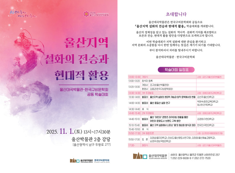 박물관 관계자는 “이번 학술대회는 연구자뿐 아니라 울산 설화에 관심 있는 시민이라면 누구나 무료로 참여할 수 있다”라며 “울산의 정체성을 담고 있는 설화 연구 성과를 함께 공유하는 뜻깊은 자리가 되길 바란다”라고 말했다.