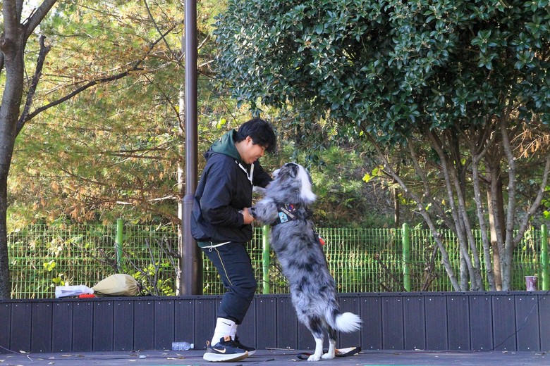 | ▲ 지난 11월 신대지구 생태회랑에서 열린 _댕댕순천, 힐링워크_ 참가자가 반려견과 함께 레크레이션을 즐기고있다 |