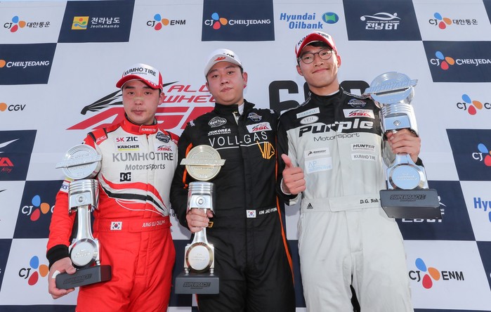 [사진설명] 김재현(가운데)이 29일 KIC에서 열린 2019 CJ대한통운 슈퍼레이스 챔피언십 7라운드 ASA 6000 클래스에서 우승한 뒤 2위 정의철(왼쪽), 3위 노동기와 포디움에 올라 자신감 있는 표정을 짓고 있다.