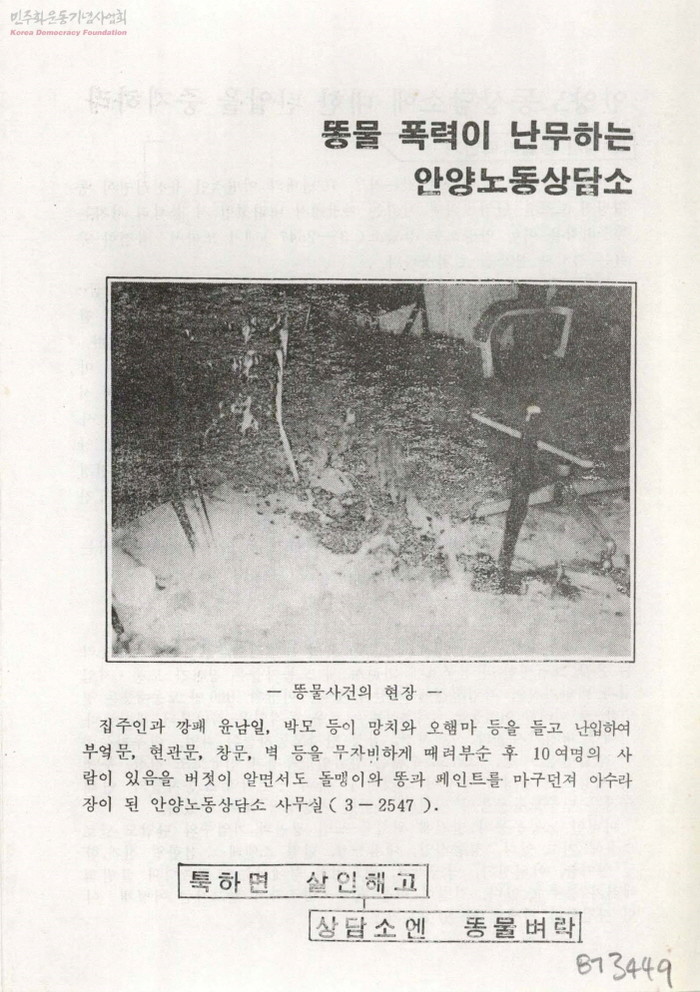 하지만, 안양이 원래 보수적인 지역이라 전태일이라는 이름이 너무 자극적이었는지 이 이름 때문에 저는 너무 심한 탄압을 받았어요. 형사들이 여러 차례 찾아와서 상담소 문을 닫으라고 협박했죠. 거절하자 건물주 아들이 선배라고 부르는 깡패 2명과 함께 와서 사무실 출입문과 창문, 문짝과 유리창 및 비품 등을 때려 부수었고, 똥물도 마구 뿌려댔어요. 심지어는 깡패 2명이 각각 제 두 팔을 붙잡아 꼼짝 못하게 만들고 얼굴 등에 인분을 바르고 나중에는 날카로운 과도로 제 목을 겨누면서 임대차 계약을 해지하라고 협박했어요.
