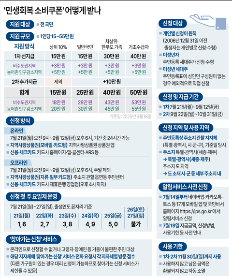 소비쿠폰은 국민 1인당 15만원을 지급하되 차상위계층과 한부모가족에게는 1인당 30만원, 기초생활수급자에게는 1인당 40만원을 지급한다.서울·인천·경기를 제외한 비수도권 지역 주민에게는 3만원이, 농어촌 인구감소지역 주민에게는 5만원이 추가로 지급된다.