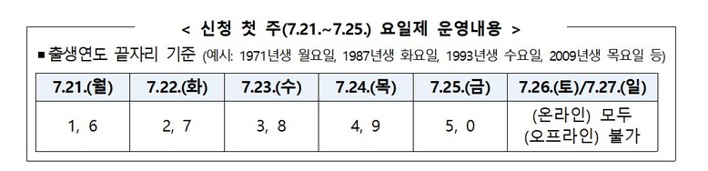 신청 첫 주인 21∼25일에는 시스템 과부하와 주민센터 혼잡 방지를 위해 출생 연도 끝자리를 기준으로 요일제를 운영한다.요일제에 따라 출생 연도 끝자리 1·6은 월요일, 2·7은 화요일, 3·8은 수요일, 4·9는 목요일, 5·0은 금요일에 신청할 수 있다. 주말에는 온라인 신청만 가능하다.