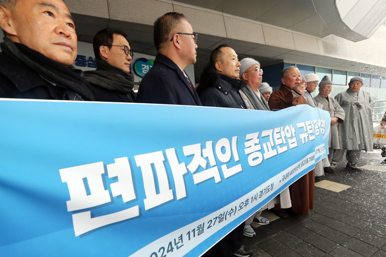 27일 오후 경기도 수원시 경기도청 앞에서 종교지도자 등 오피니언 리더들이 경기도와 경기관광공사의 편파적인 종교탄압에 대해 규탄의 목소리를 내고 있다.