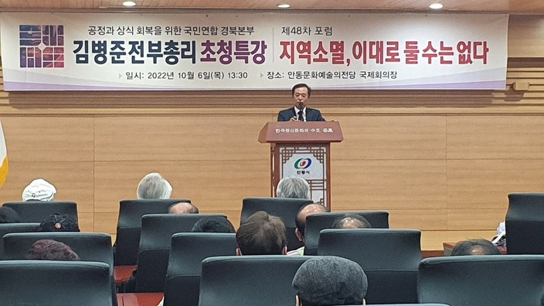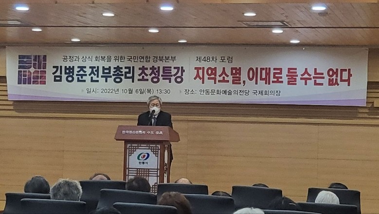 [세계타임즈 백진욱 기자] 10월 6일 《공정과 상식 회복을 위한 국민연합》의 경상북도 지역본부가 ”지역소멸 이대로 둘 수는 없다“를 주제로 김병준 전 부총리를 초청하여 경북 안동문화예술의 전당 국제회의실에서 제48차 포럼을 개최했다. 이날 포럼은 약 230여 명의 공정과 상식 포럼 회원 및 각계 지역 인사가 참석한 가운데 사회적 거리두기 지침에 따라 진행되었다.