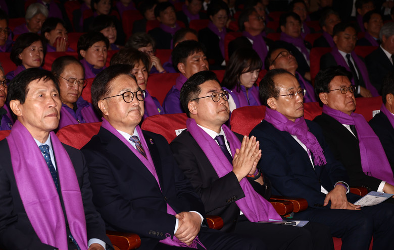 우원식 국회의장을 비롯한 여야 원내대표들이 29일 오전 서울 여의도 국회에서 열린 10.29 이태원참사 2주기 국회 추모제에 참석해 자리하고 있다.