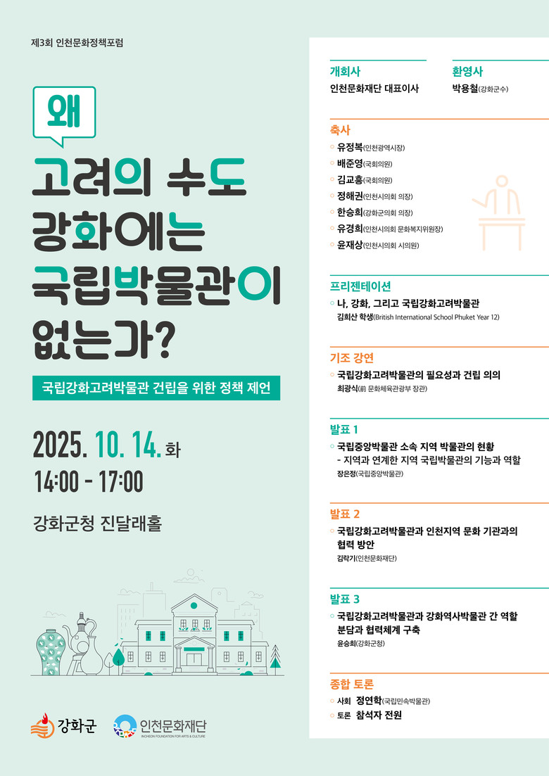 이번 포럼은 강화군과 인천문화재단이 공동으로 주최하며, 39년간 고려의 수도였던 강화에 국립박물관이 없는 현실을 논의의 출발점으로 삼고 있다.