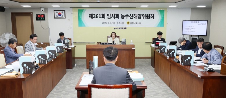 [충남 세계타임즈=이현진 기자] 충남도의회 농수산해양위원회(위원장 이연희)는 4일 제361회 임시회 제1차 회의에서 충남도 남부출장소‧농업기술원 소관 2025년 추가경정예산안과 남부출장소 2025년도 출연계획안을 심사했다.