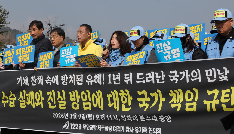 무안공항 제주항공 여객기 참사 유가족 협의회 소속회원들이 9일 서울 청와대 사랑채 앞에서 초기 수습 실패와 국가 책임 규탄 기자회견을 하고 있다. 2026.3.9