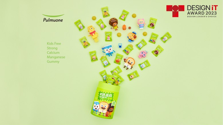 이번 디자인 어워드에서 동상을 수상한 ‘키즈프리 튼튼칼슘망간구미’는 성장기 아이들에게 필요한 칼슘, 망간 등 필수 영양소와 국내산 유기농 야채농축액 6종을 엄선해 부원료로 담은 젤리 형태의 어린이 건강기능 식품이다. 패키지디자인에는 그린 그라데이션 컬러를 사용해 달콤한 샤인머스캣 플레이버를 상징적으로 나타내어 시각적 이해도를 높였다. 여기에 어린이들에게 친숙한 한국의 애니메이션 <브레드 이발소>의 천재이발사 브레드와 조수 윌크, 초코 등 다양한 캐릭터를 활용했다. ‘글로벌 디자인 잇 어워드(Global Design iT Award)’ 글로벌심사위원단은 “유니크하고 경쾌한 디자인을 통해 제품 사용자인 어린이의 즐거움과 호기심을 표현함으로써 상품의 특징을 잘 나타냈다”고 심사평을 밝혔다.