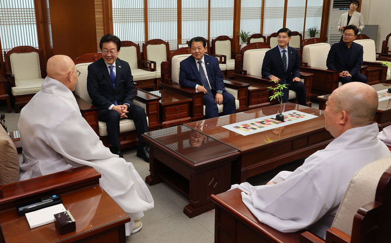 [세계타임즈 = 신상철 기자] 더불어민주당 이재명 대표가 15일 오전 서울 종로구 한국불교역사문화기념관에서 조계종 총무원장인 진우스님을 예방해 대화하고 있다. 2024.9.15