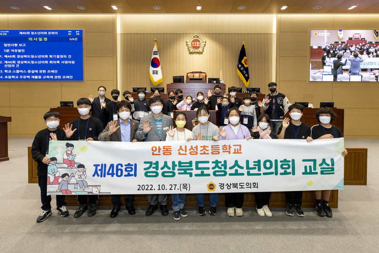 [경북=세계타임즈 한성국 기자] 경상북도의회는 2022.10.27.(목) 14:00 도의회 본회의장에서 안동 신성초등학교 5,6학년 20여명이 참여한 「제46회 경상북도청소년의회 교실」을 개최했다.