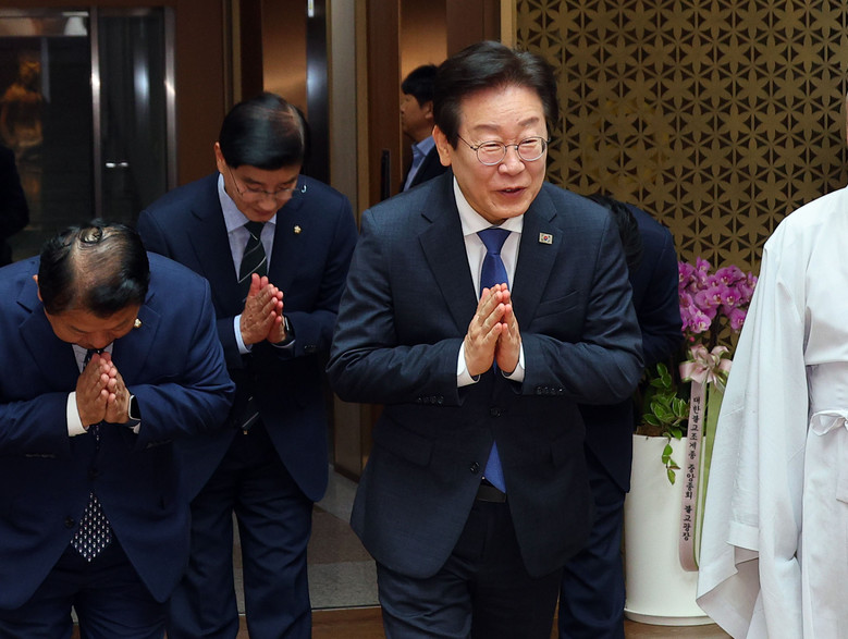 [세계타임즈 = 신상철 기자] 더불어민주당 이재명 대표가 15일 오전 서울 종로구 한국불교역사문화기념관에서 조계종 총무원장인 진우스님을 예방, 합장하고 있다. 2024.9.15