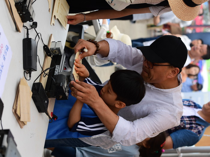 아빠랑 같이 작품 만들어봐요~ 2018 화성 뱃놀이 축제장을 찾은 가족이 목공체험에 집중하고 있는 모습. 2018 화성 뱃놀이 축제는 내달 3일까지 전곡항과 제부도에서 열리며, 프로그램 및 공연과 관련한 자세한 사항은 ‘2018 화성 뱃놀이 축제’홈페이지(www.hs-festival.co.kr)에서 확인할 수 있다.