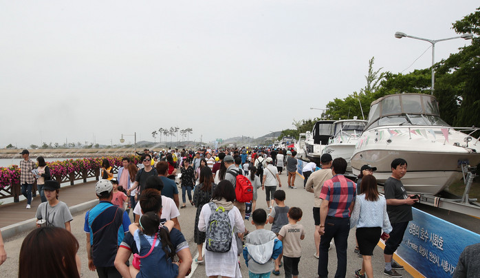휴일 나들이 나온 인파로 가득한 2018 화성 뱃놀이 축제장. 축제는 내달 3일까지 전곡항과 제부도에서 열리며, 프로그램 및 공연과 관련한 자세한 사항은 ‘2018 화성 뱃놀이 축제’홈페이지(www.hs-festival.co.kr)에서 확인할 수 있다.