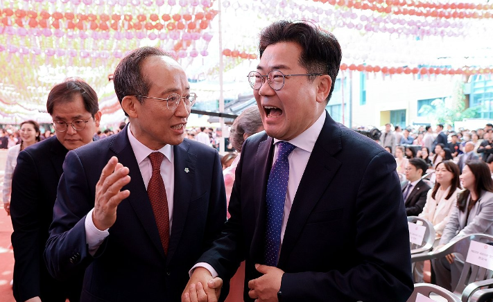 국민의힘 추경호 원내대표(왼쪽)가 15일 서울 종로구 조계사에서 열린 불기 2568년 부처님오신날 봉축법요식에 참석해 더불어민주당 박찬대 원내대표와 대화하고 있다.