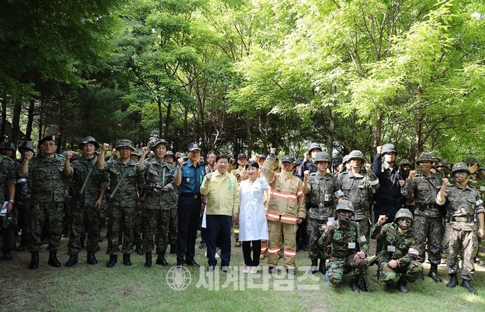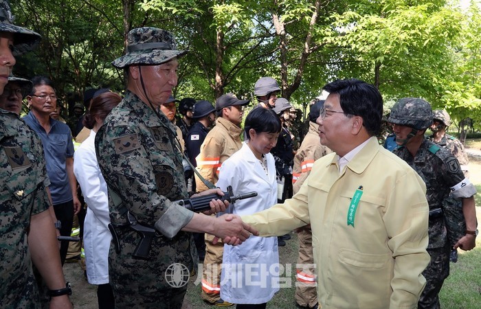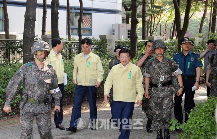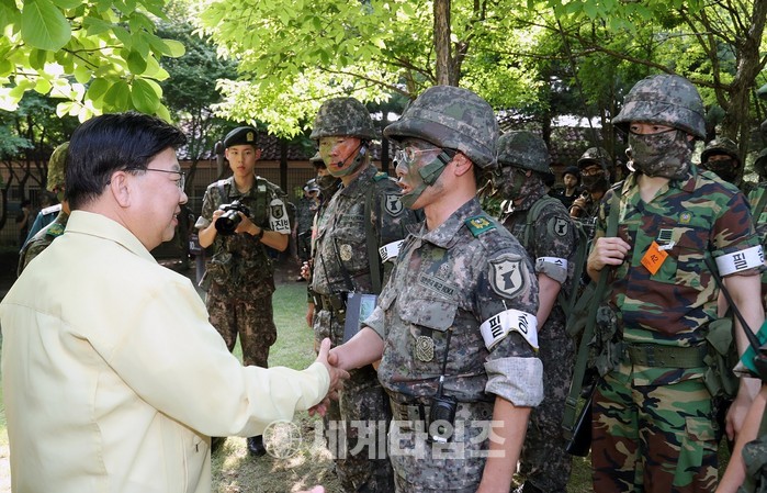 [대전=세계타임즈 이장성 기자] 권선택 통합방위협의회 의장이 19일 화랑훈련 기간 중 국가중요시설 방호훈련에 참여하는 예비군과 군 장병들을 위문했다.