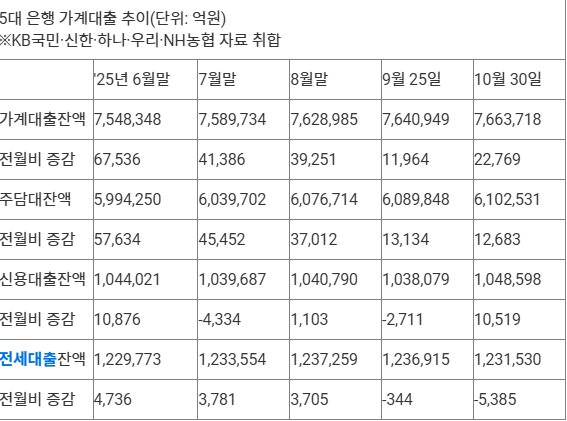 2일 금융권에 따르면 5대 은행(KB국민·신한·하나·우리·NH농협)의 전체 가계대출 잔액(766조3천718억원)은 이달 들어 2조2천769억원 불었다.9월(+1조1천964억원)의 약 2배지만, 앞서 '영끌'(영혼까지 끌어모아 주택구입)이 절정이던 6월(+6조7천536억원)과 비교하면 3분의 1 수준에 불과하다. 7월(+4조1천386억원)·8월(+3조9천251억원)보다도 적다.특히 주택담보대출 증가 폭이 1조2천683억원(608조9천848억원→610조2천531억원)에 그쳤다. 급감한 9월(+1조3천134억원)에도 미치지 못했고, 작년 10월(+1조923억원) 이후 가장 적다.