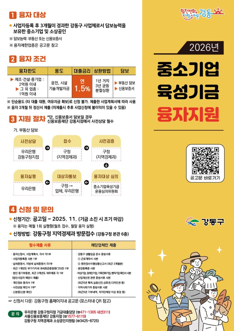 이수희 강동구청장은 “재정이 어려운 상황이지만, 지역경제의 뿌리인 소상공인을 지키는 일은 늦출 수 없다”며 “금융지원과 지역화폐 발행을 상반기에 집중해 상권이 버틸 수 있는 시간을 만들고, 회복의 계기를 마련함과 동시에 소상공인과 주민들이 제도를 몰라서 지원 기회를 놓치는 일이 없도록 세심히 살펴 적극적인 홍보와 현장 중심 지원을 이어가겠다”고 밝혔다.