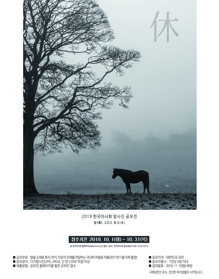 올해 9년 만에 부활한 말 사진 공모전 ‘말(馬) 그리고 휴식’은 말에 대한 애호정신을 바탕으로 한 과거 사진전의 전통을 계승하면서, 최근 트렌드를 반영하여 제출형식을 디지털 파일로 완전히 전환하고, 온라인으로 간편하게 접수하는 방식을 채택했다. 접수는 올해 10월 1일부터 31일까지 오픈되는 공모전 홈페이지를 통해 가능하다.
