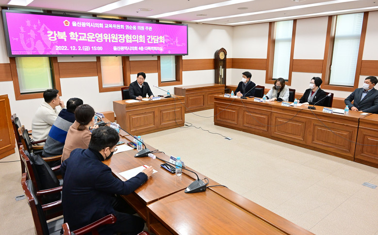 [울산 세계타임즈=이호근 기자] 울산광역시의회 권순용 의원(교육위원회)은 2일 오후 3시, 강북 학교운영위원장협의회 임원 8명과 함께 간담회를 개최하고, 학교 급식단가 인상, 조리사 파업 시 대체식 지급 및 학교운영위원장협의원 지원 등에 대해 의견을 청취했다.