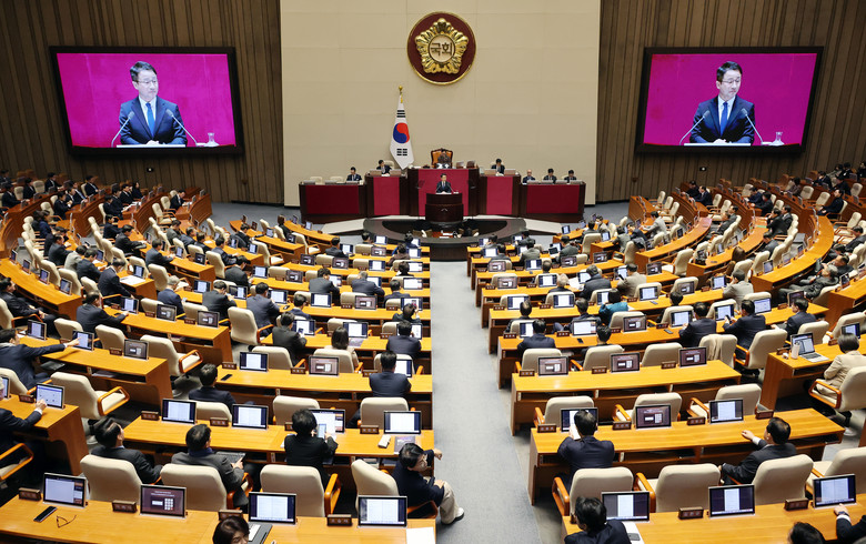 더불어민주당 한병도 원내대표가 3일 국회에서 열린 제432회 국회(임시회) 제2차 본회의에서 국정에 관한 교섭단체 대표 연설을 하고 있다. 2026.2.3