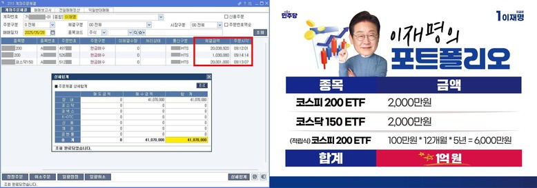 이 후보는 실제로 5년간 1억원 규모로 국내 ETF(상장지수펀드)에 투자하는 자신의 포트폴리오를 공개하고, '코스피 5000' 공약 달성 의지도 거듭 피력했다.이 후보는 이날 '코스피 200' 투자 ETF, '코스피 150' 투자 ETF 상품을 2천만원씩 매수했고, '코스피 200'에 투자하는 적립식 ETF에 월 100만원씩 5년간 투자(총 6천만원)를 약정했다.