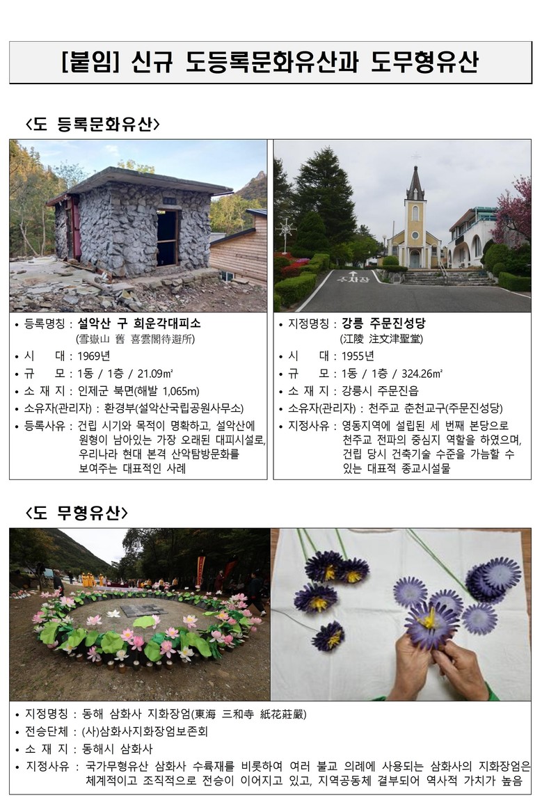 도등록문화유산과 등록과 함께 ‘동해 삼화사 지화장엄’도 도무형유산으로 지정된다. 삼화사 수륙재(국가무형유산)를 비롯한 불교 의례에 사용되는 지화장엄은 지역 공동체에서 체계적으로 전승돼 그 가치가 높게 평가된다.
