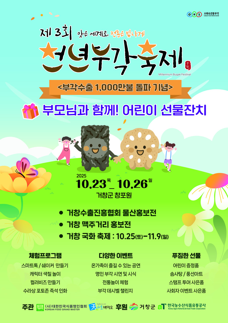 한편 부각의 본고장 경남 거창군은 천혜의 자연환경과 농산물의 뛰어난 품질을 바탕으로 전통식품 산업이 꾸준히 성장해 왔다. 또한 행사 장소인 거창창포원은 수려한 자연경관과 넓은 광장, 가족친화형 공간이 조성되어 있어 매년 많은 관광객이 찾는 거창의 대표 명소다.