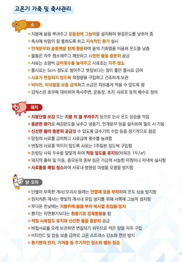 도는 여름철 축산재해 대응을 위해 5월 15일부터 오는 10월 15일까지 축산재해대책반 T/F 운영 중이며, 폭염 최소화를 위해 신속 대응 및 적기 조치에 만전을 기하고 있다.