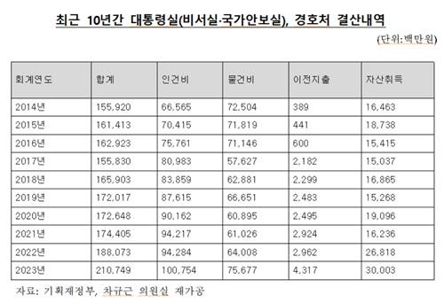 최근 10년간 대통령실(비서실·국가안보실), 경호처 결산내역[차규근 의원실 제공]