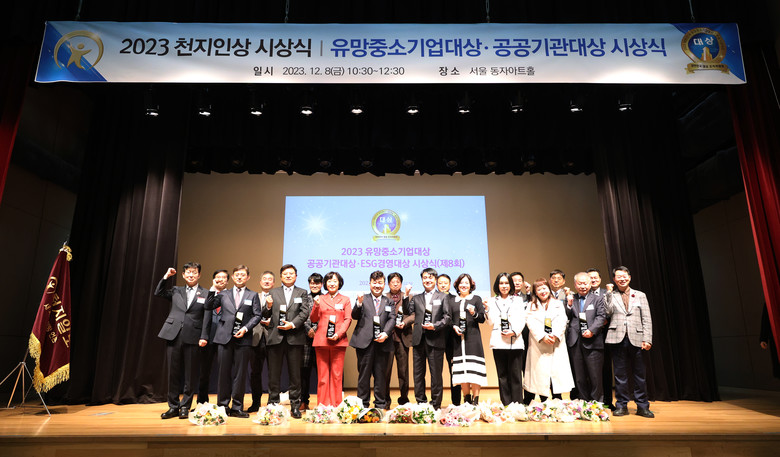 (천지일보(대표 이상면)와 ISO국제심사원협회(공동대표 박명서·배선장) 주최로 8일 서울 용산구 KDB생명타워 동자아트홀에서 열린 ‘제8회 2023 대한민국 유망중소기업대상·공공기관대상 시상식’에서 유망중소기업대상·공공기관대상 수상자들과 참석자들이 기념촬영을 하고 있다)