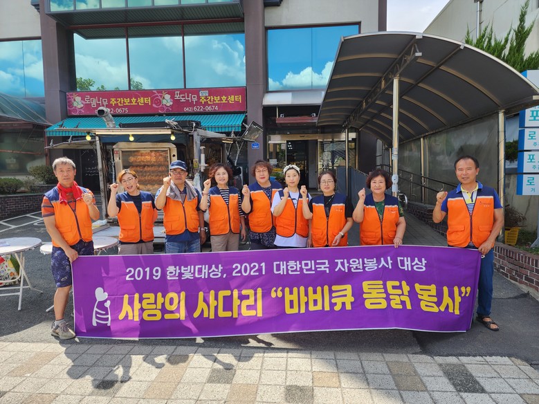 [대전 세계타임즈=이채봉 기자] 1만 명 회원이 가입돼 있는 대전시 SNS 봉사단체 사랑의 사다리 밴드(리더 이정제)는 6일 오후 3시에 대덕구 오정동에 위치한 로뎀중증장애인거주시설(원장 김운중)에서 바비큐 통닭 40마리 봉사로 우리 사회의 따뜻한 사랑을 전달하였다.