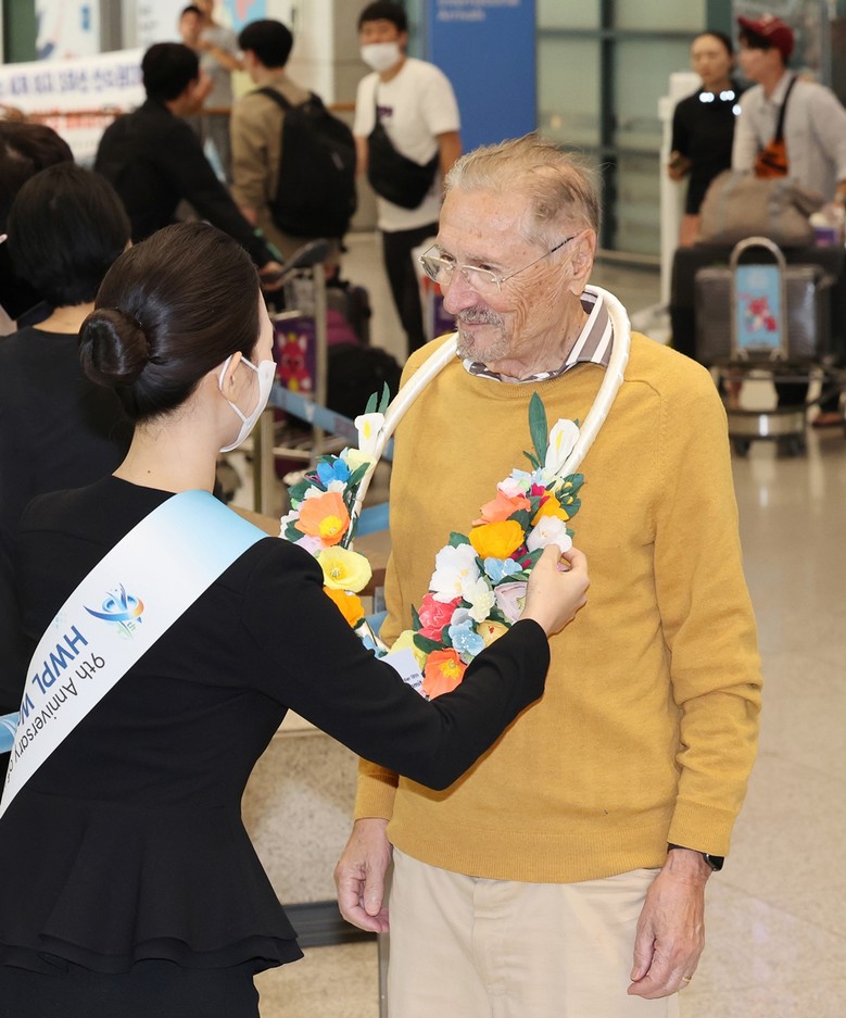[세계타임즈 = 백진욱 기자] 하늘문화세계평화광복(대표 이만희·이하 HWPL)이 오는 18일부터 21일까지 9·18 평화만국회의 제9주년 기념식을 개최하는 가운데, 에밀 콘스탄티네스쿠 루마니아 전 대통령이 HWPL 공항영접부로부터 꽃다발을 증정받고 있다.
