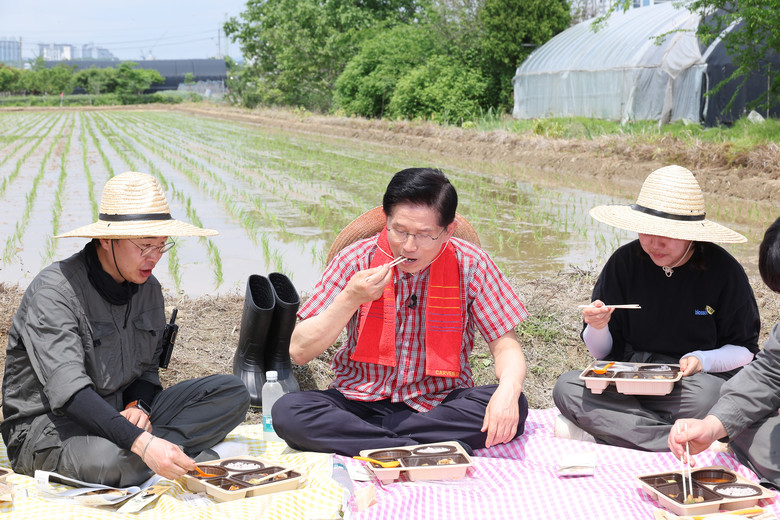 국민의힘 김문수 대선 후보가 21일 경기 고양시 덕양구에서 열린 '고양시 청년농업인 모내기 및 새참간담회' 행사에 참석해 청년농업인들과 도시락을 먹고 있다. 2025.5.21